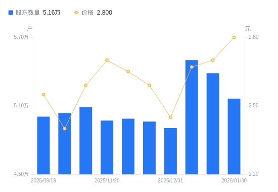 近一年(2025年2月28日至2026年1月30日),华塑股份A股股东户数从5.51万户,减低至5.16万户,降幅6.35%,区间股价上涨15.70%。