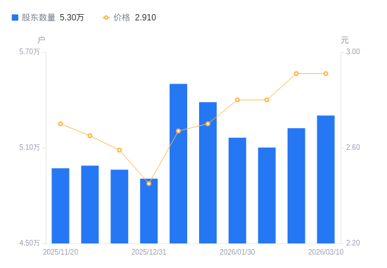 近一年(2025年3月10日至2026年3月10日),华塑股份A股股东户数从5.45万户,减低至5.3万户,降幅2.68%,区间股价上涨25.97%。