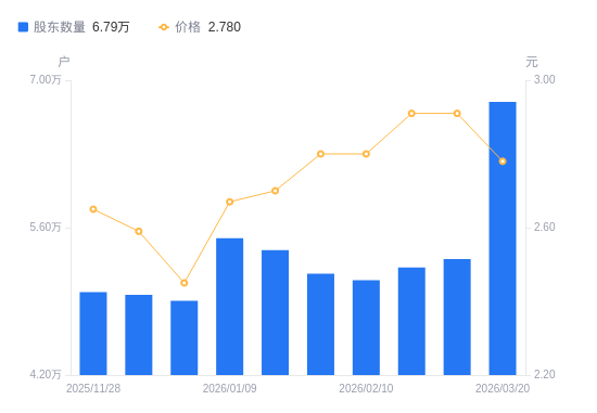 近一年(2025年3月31日至2026年3月20日),华塑股份A股股东户数从5.42万户,增加至6.79万户,增幅25.48%,区间股价上涨15.83%。