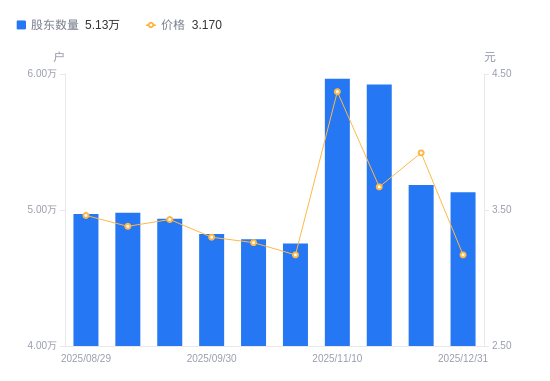 近一年(2024年12月31日至2025年12月31日),重庆建工A股股东户数从5.48万户,减低至5.13万户,降幅6.40%,区间股价上涨2.92%。