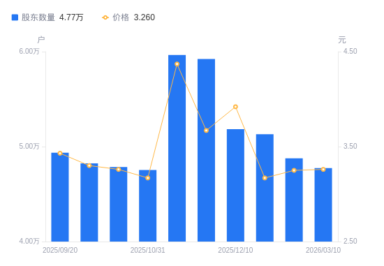 近一年(2025年3月31日至2026年3月10日),重庆建工A股股东户数从4.96万户,减低至4.77万户,降幅3.82%,区间股价上涨23.48%。