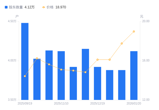 1月30日消息,数据显示,截至2026年1月20日,株冶集团A股股东总户数为4.12万户,较上期(2026年1月9日)增加2400户,增幅6.19%。公司最新A股总股本为10.73亿股,其中流通A股7.52亿股,户均持有流通A股数量为1.82万股,较上期减少1128.73股,降幅5.83%;户均持流通A股市值34.62万元,较上期增加2227.37元,增幅0.65%。