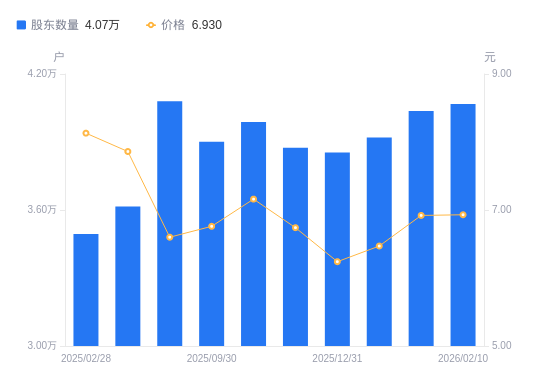 近一年(2025年2月28日至2026年2月10日),恒源煤电A股股东户数从3.49万户,增加至4.07万户,增幅16.39%,区间股价下跌14.13%。