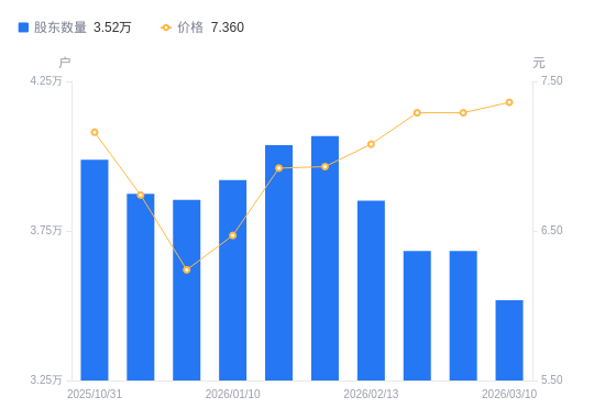 近一年(2025年2月28日至2026年2月28日),恒源煤电A股股东户数从3.49万户,增加至3.68万户,增幅5.39%,区间股价下跌9.67%。