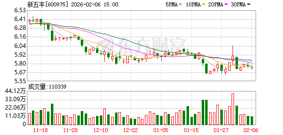 同时,公司股价也陷入长期低迷。截至2026年2月6日,新五丰收盘价为 5.73元/股,自2025年9月高点7.05元已回落约16%;近三个月跌幅达10.33%。