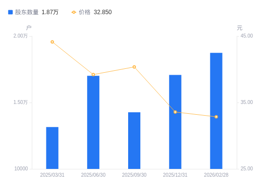 近一年(2025年2月28日至2026年2月28日),健民集团A股股东户数从1.62万户,增加至1.87万户,增幅15.41%,区间股价下跌16.67%。
