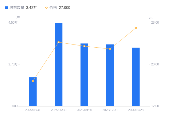 近一年(2025年2月28日至2026年2月28日),北矿科技A股股东户数从2.1万户,增加至3.42万户,增幅62.95%,区间股价上涨68.38%。