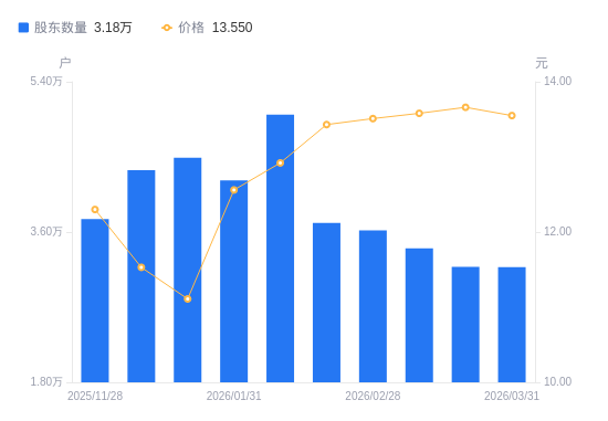 4月1日消息,数据显示,截至2026年3月20日,淮北矿业A股股东总户数为3.18万户,较上期(2026年3月10日)减少2216户,降幅6.51%。公司最新A股总股本为26.93亿股,其中流通A股26.93亿股,户均持有流通A股数量为8.46万股,较上期增加5504.7股,增幅6.96%;户均持流通A股市值115.55万元,较上期增加8.15万元,增幅7.59%。