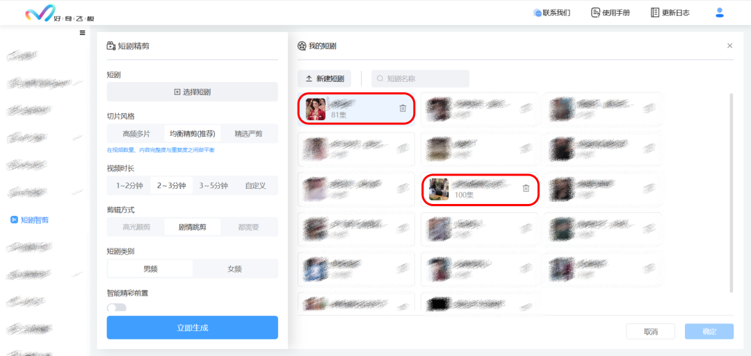 剧集配置:勾选短剧并配置切片要求,多部短剧可多端并行操作