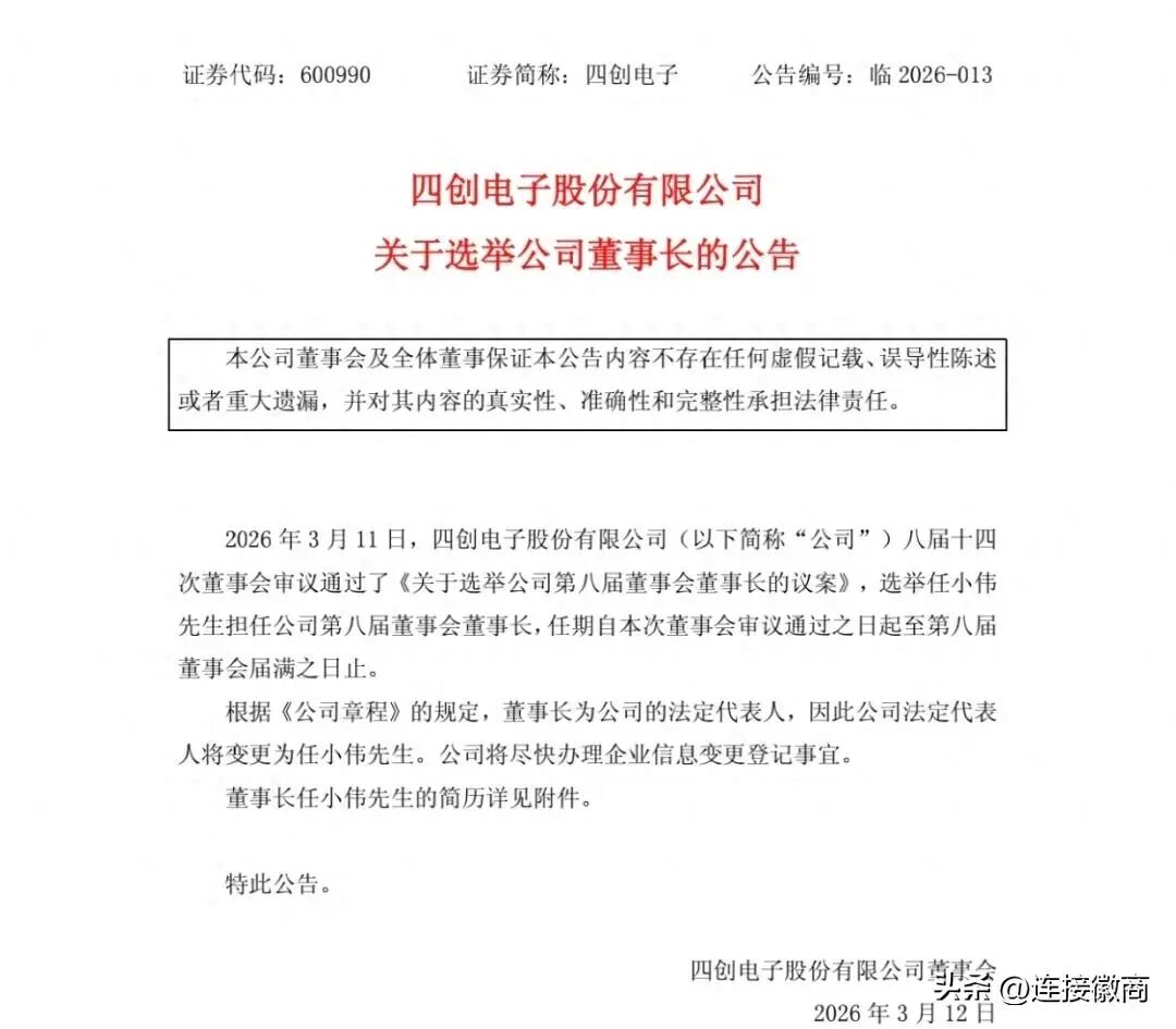 3月11日,四创电子股份有限公司(以下简称“公司”)八届十四次董事会审议通过了《关于选举公司第八届董事会董事长的议案》,选举任小伟担任公司第八届董事会董事长,任期自本次董事会审议通过之日起至第八届董事会届满之日止。