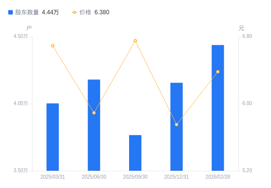 近一年(2025年2月28日至2026年2月28日),开滦股份A股股东户数从4.04万户,增加至4.44万户,增幅9.82%,区间股价上涨0.47%。