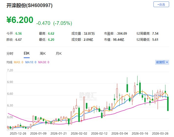 格隆汇3月31日|开滦股份(600997.SH)现跌7.05%报6.2元,股价创月内新低。开滦股份公布2025年年度报告,期内公司实现营收173.91亿元,同比下降17.87%;归属于上市公司股东的净亏损3237.43万元。(格隆汇)
