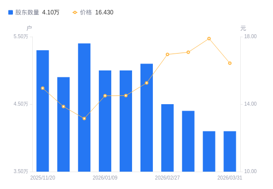 4月1日消息,数据显示,截至2026年3月31日,晋控煤业A股股东总户数为4.1万户,较上期(2026年3月20日)不变。公司最新A股总股本为16.74亿股,其中流通A股16.74亿股,户均持有流通A股数量为4.08万股,较上期不变;户均持流通A股市值67.07万元,较上期减少5.96万元,降幅8.16%。