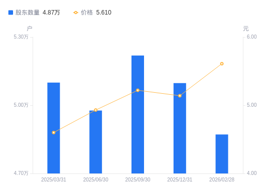 近一年(2025年2月28日至2026年2月28日),晋亿实业A股股东户数从5.37万户,减低至4.87万户,降幅9.26%,区间股价上涨12.20%。