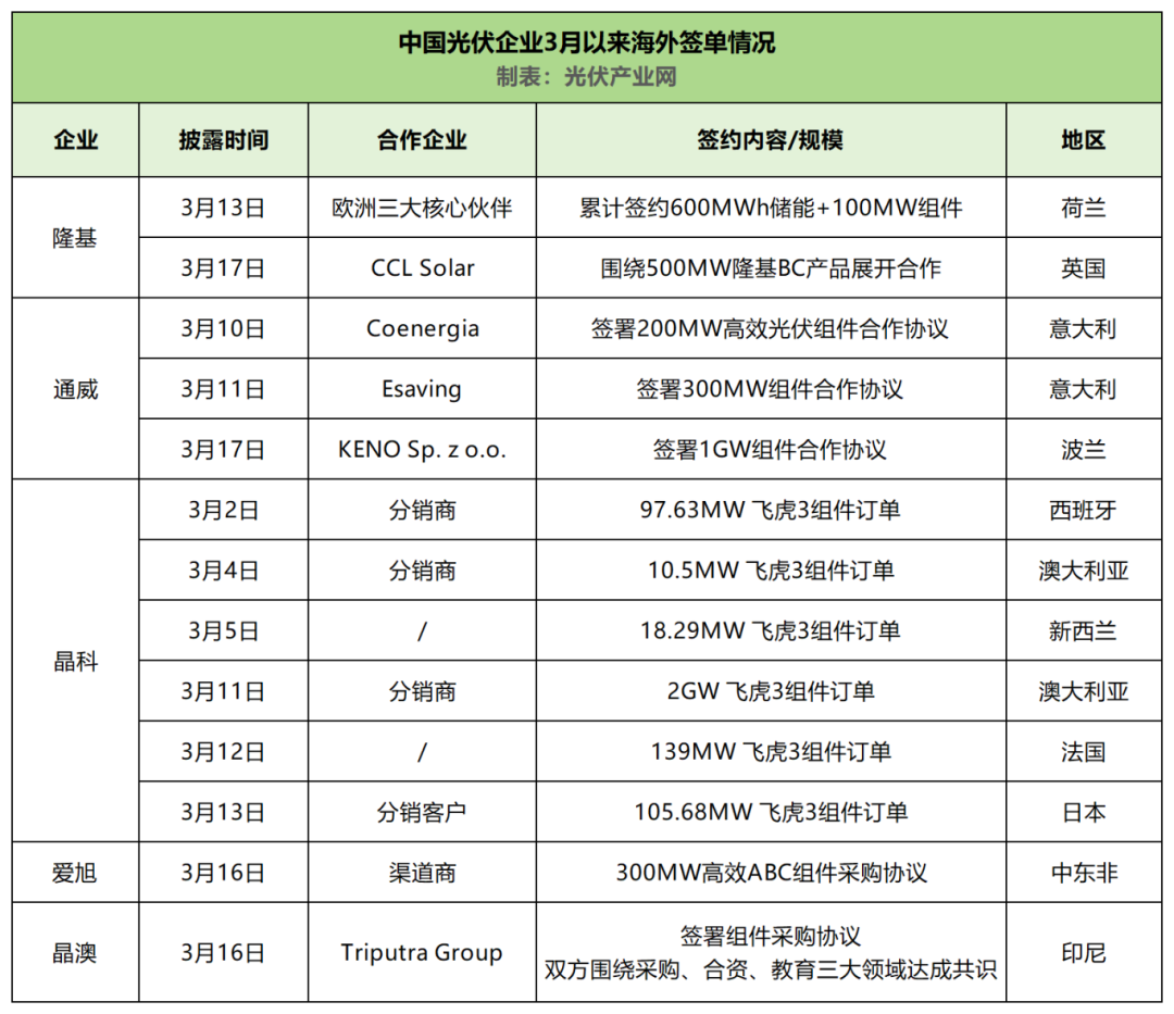 隆基、通威、晶澳、晶科、爱旭等多家头部企业相继披露拿下海外订单,覆盖欧洲、亚洲、大洋洲等多个区域,海外市场拓展步伐持续加快,已披露的签约规模总计超4.77GW。