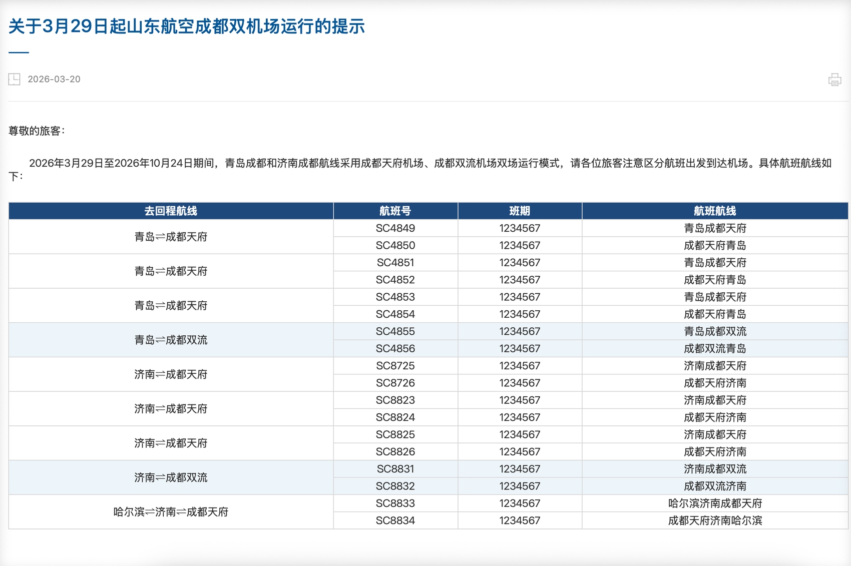3月22日,四川在线记者查询山东航空、春秋航空官方网站获悉,自3月29日民航夏秋航季起,两家航司将重返成都双流机场,正式开启成都“两场”运行模式。