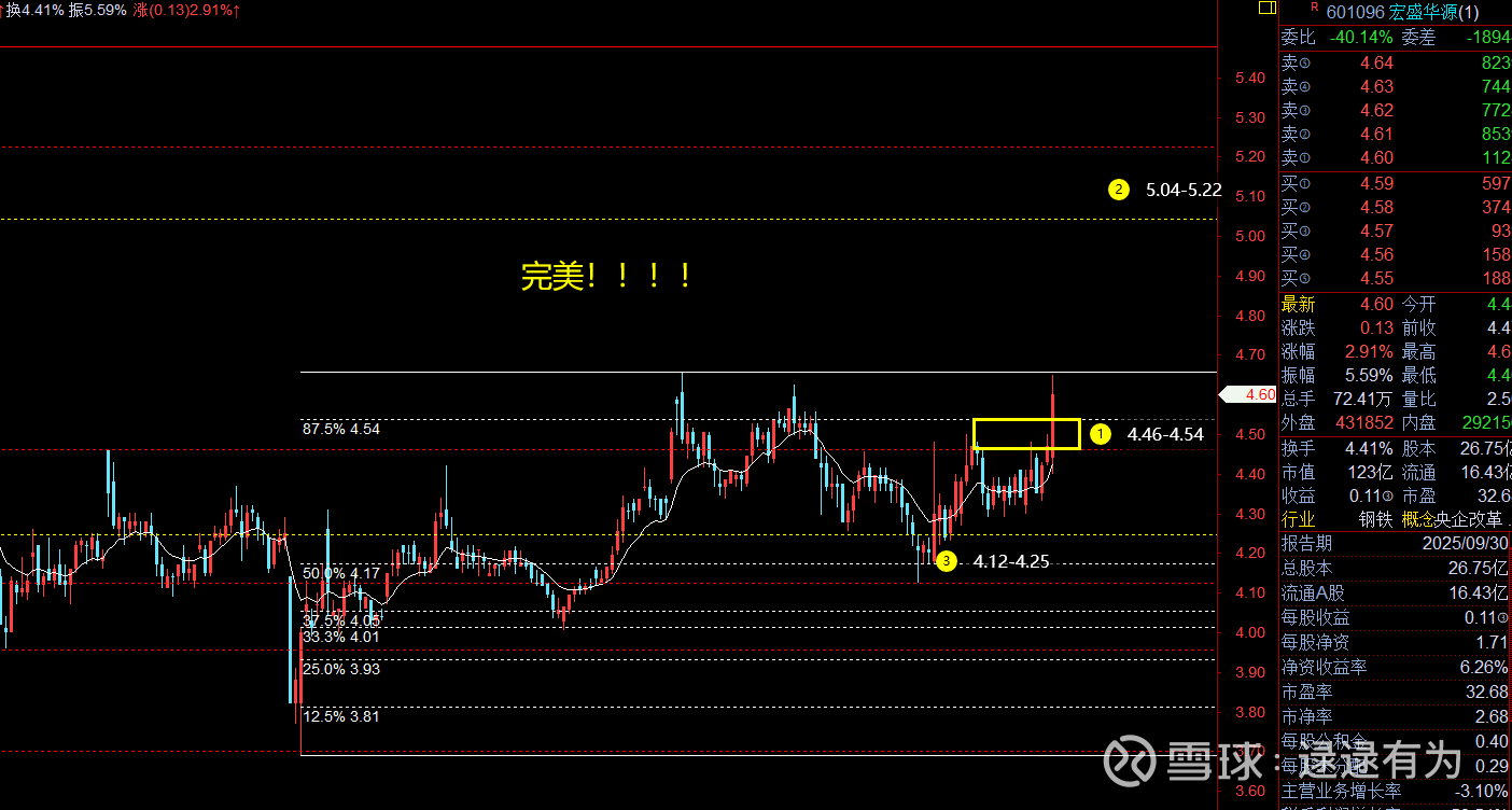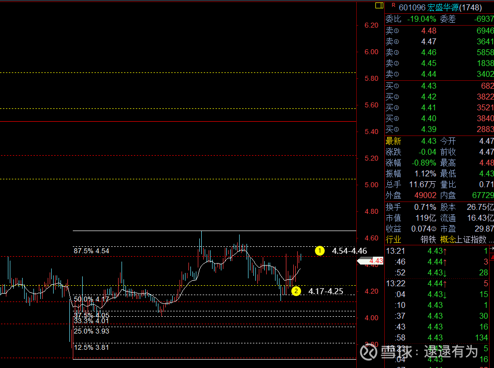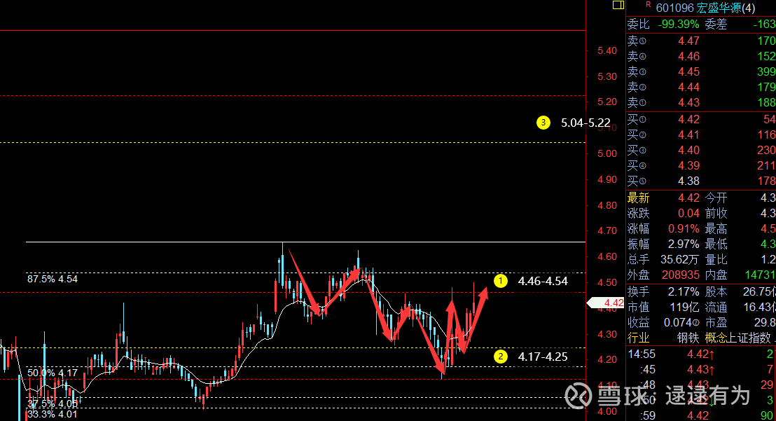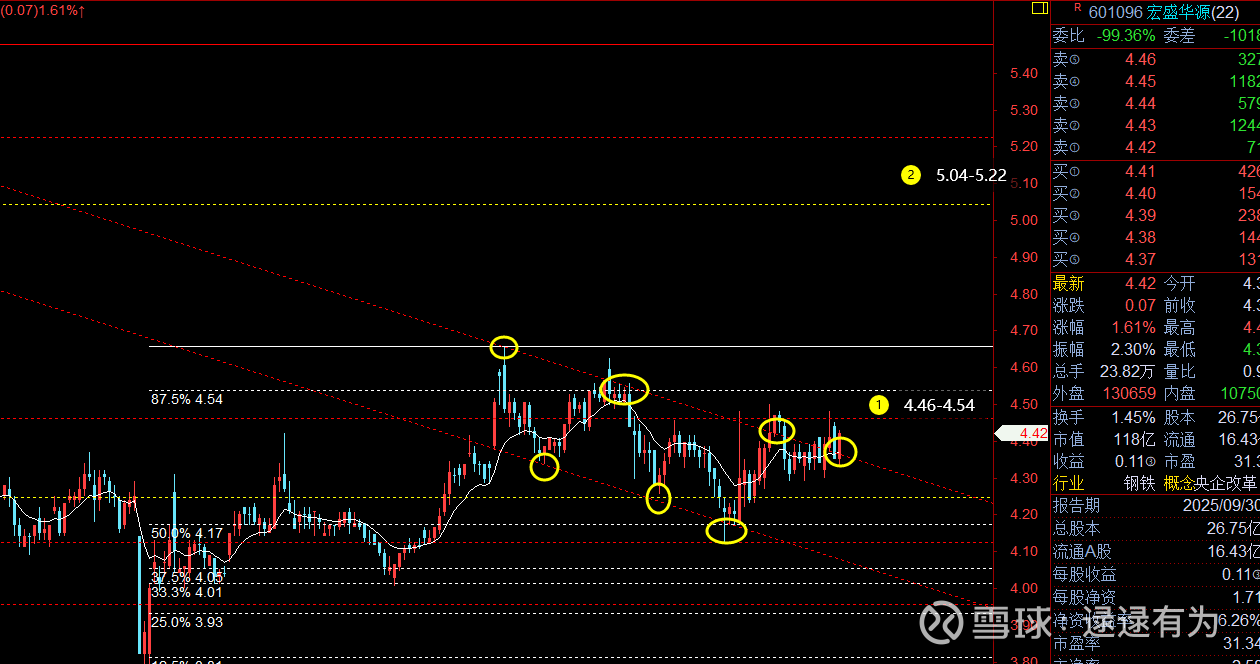 : 除权后价格略微有变动,这波回踩比预期略微深了一些,但也不算太深,结构总体没有改变。当前空间支撑4.17-4.25区间,阻力4.46-4.54(周五遇阻位置)、4.8、5.04-5.22区间。周五异动,后面可重视。
