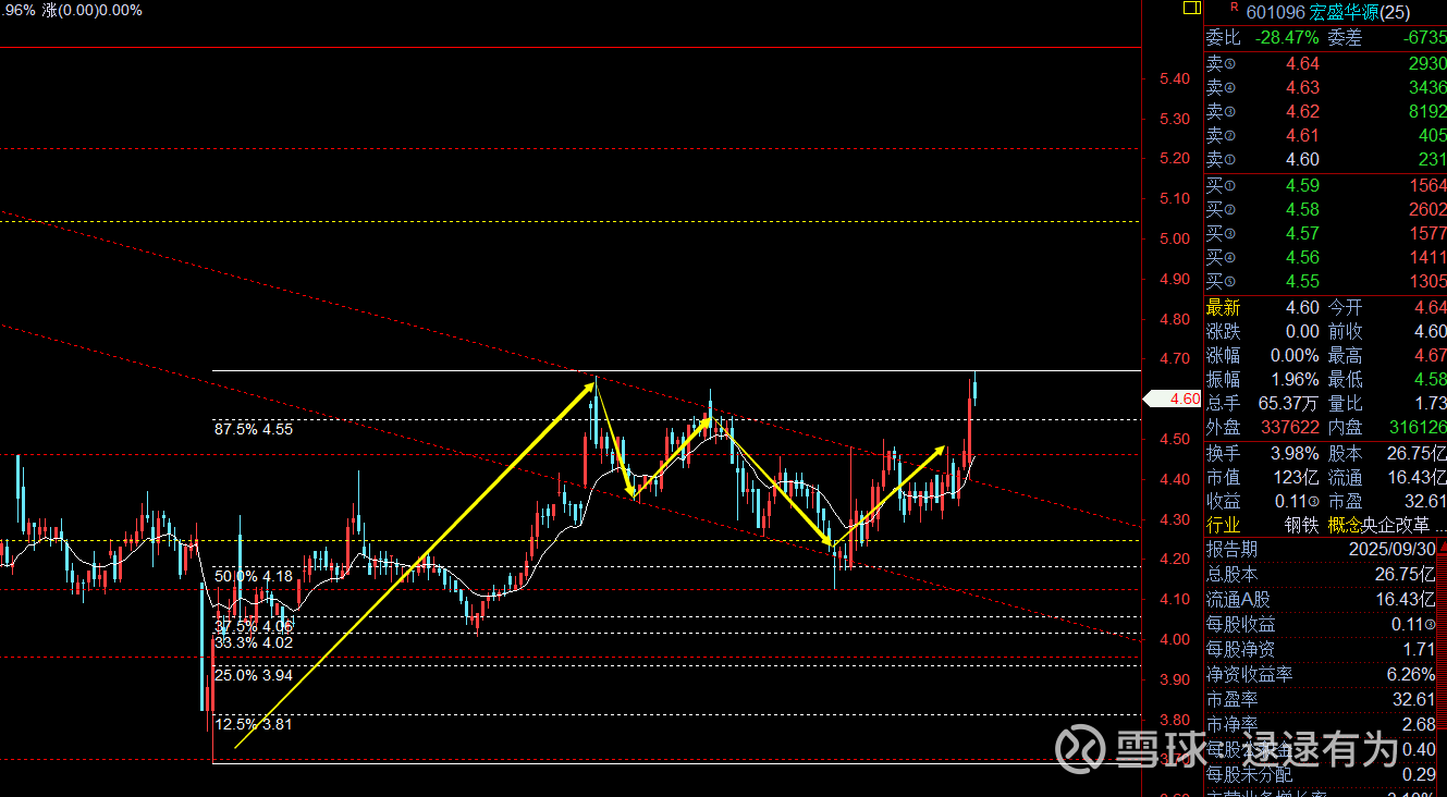 :宏盛,回踩4.49支撑点,压力5.07-5.25区间。短期进入高波。