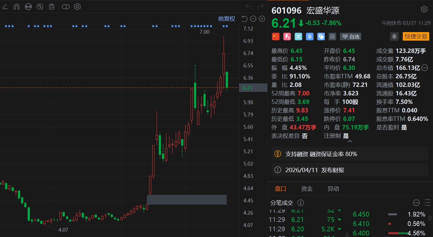 宏盛华源(601096.SH)午间收跌近8%,昨日该股一度触及涨停且刷新近期高点,现报6.21元,总市值166亿元。消息上,宏盛华源公告,大股东国新建源及一致行动人建信投资合计持股4.78亿股,占17.86%;其中国新建源3.58亿股,占13.39%,建信投资1.19亿股,占4.46%。两者计划自2026年3月20日至2026年6月19日通过集中竞价分别减持不超2006.37万股和668.79万股,合计不超2675.16万股,占1.00%,且任意连续90日减持总数不超1.00%。目前,公司董事长为马新征,董秘为丁刚,员工人数为1505人,实际控制人为国务院国有资产监督管理委员会。