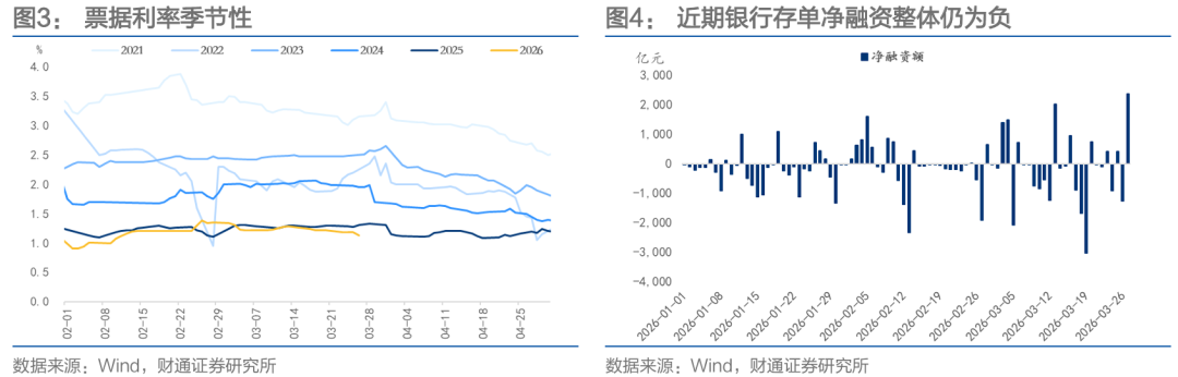 首先,3月以来票据利率回落,或指向贷款需求边际弱化,配债资金更加充裕。2月票据利率有所回升,3月再度走低,贷款动能可能再度弱化。