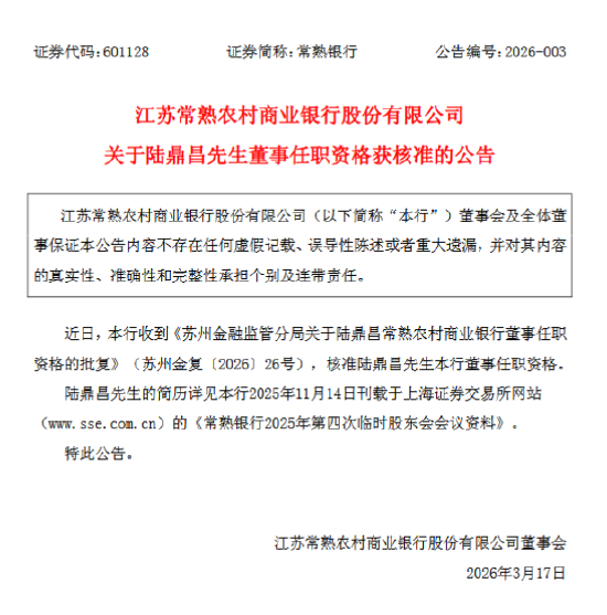 3月17日金融一线消息,常熟银行今日发布公告称,近日该行收到《苏州金融监管分局关于陆鼎昌常熟农村商业银行董事任职资格的批复》(苏州金复〔2026〕26号),核准陆鼎昌该行董事任职资格。