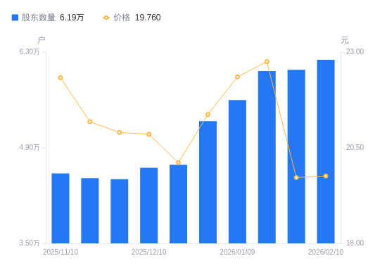 近一年(2025年2月10日至2026年2月10日),博威合金A股股东户数从4.03万户,增加至6.19万户,增幅53.49%,区间股价下跌1.34%。