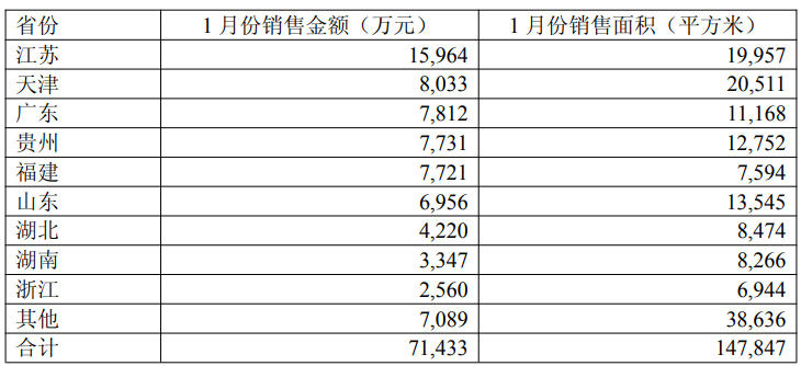 在销售情况方面,公司1月份实现合同销售金额约7.14亿元,比上年同期下降29.79%;销售面积约15万平方米,比上年同期增长27.85%。