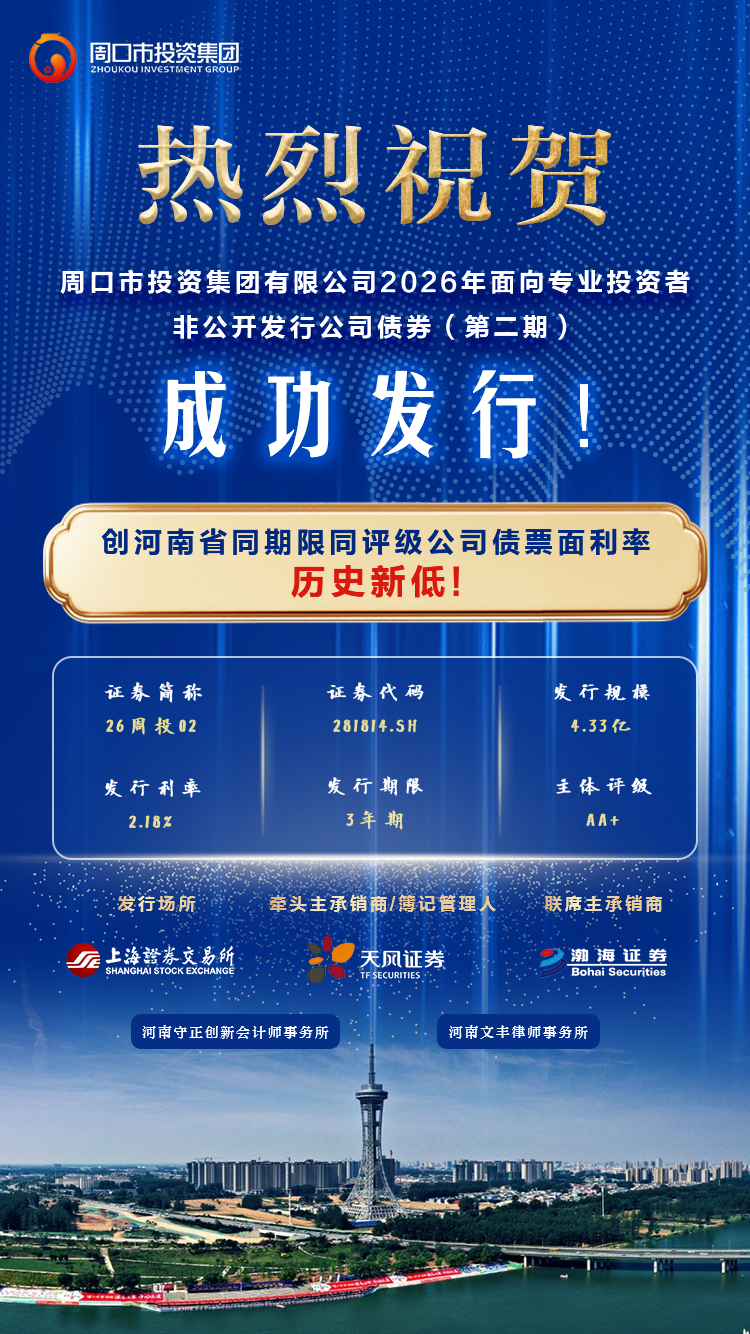 近日,由天风证券担任牵头主承销商及簿记管理人的周口市投资集团有限公司2026年面向专业投资者非公开发行公司债券(第二期)在上海证券交易所成功发行。