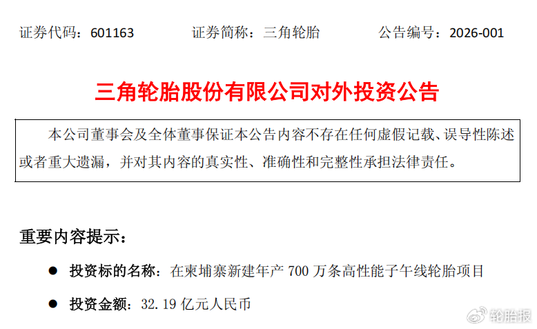 1月15日,三角轮胎股份有限公司正式发布公告,宣布了一项里程碑式的海外投资计划。公司拟投资32.19亿元人民币,在柬埔寨柴桢省设立全资子公司,建设一座全新的轮胎制造工厂。