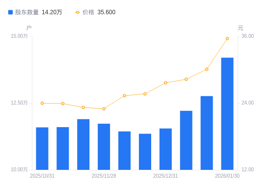 近一年(2025年2月10日至2026年1月30日),西部矿业A股股东户数从10.9万户,增加至14.2万户,增幅30.28%,区间股价上涨110.78%。