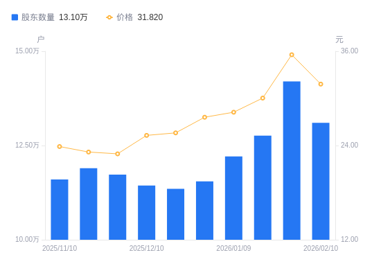 近一年(2025年2月10日至2026年2月10日),西部矿业A股股东户数从10.9万户,增加至13.1万户,增幅20.18%,区间股价上涨88.84%。