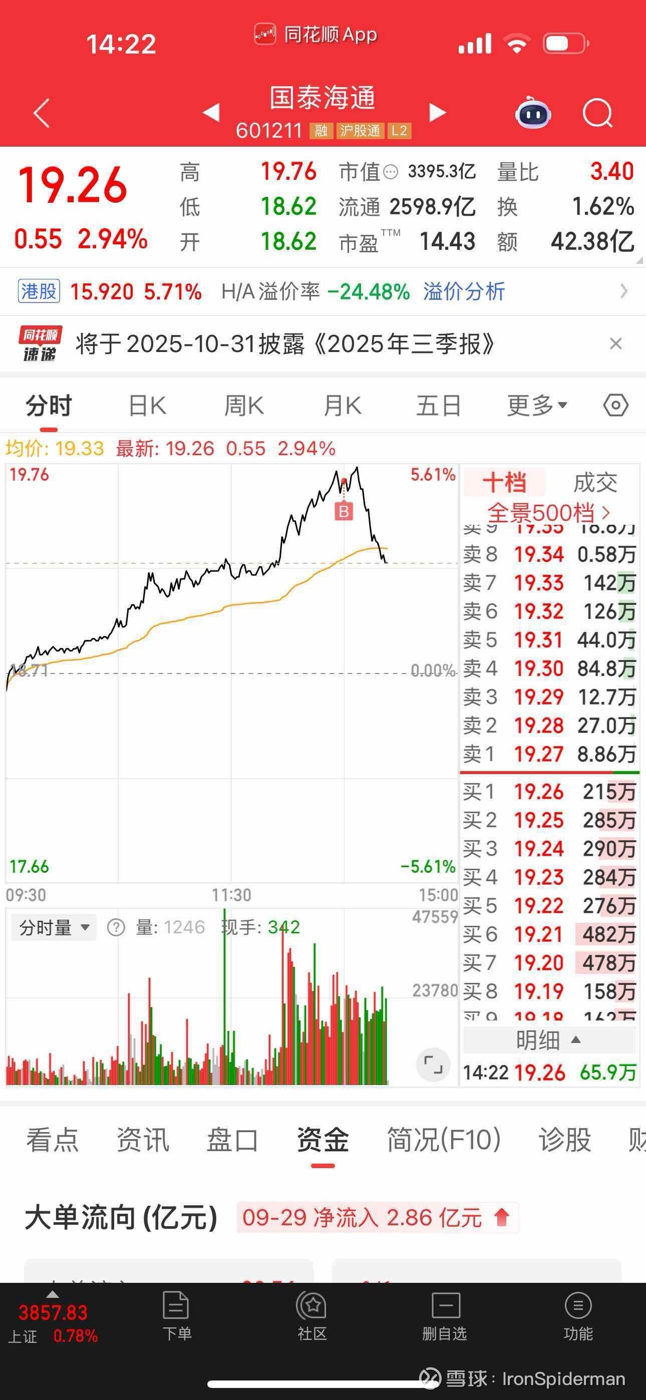股价19.68元附近,再减持10万股国泰海通A股,短线买进的20万股全抛光了。第一、二轮买的筹码,一手也不想抛。