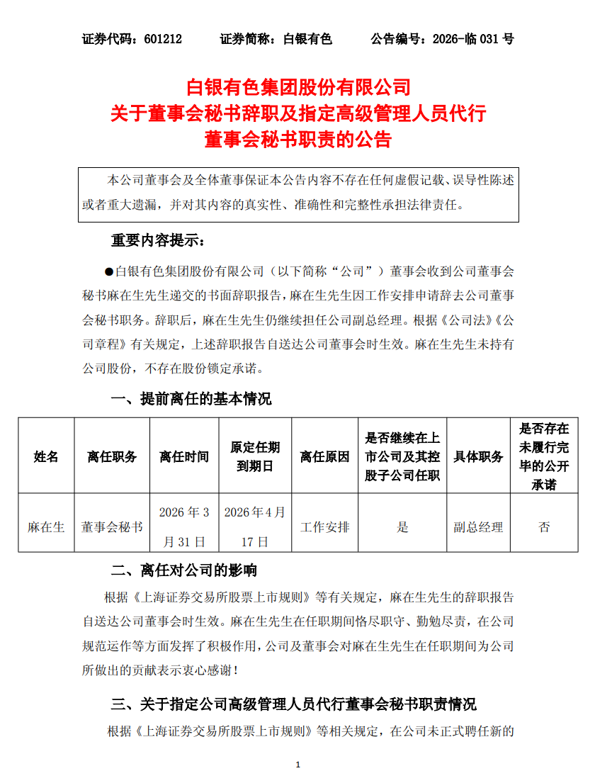4月1日,白银有色(601212)(601212.SH)发布公告称,公司董事会收到公司董事会秘书麻在生先生递交的书面辞职报告。根据公告披露,麻在生先生因工作安排申请辞去公司董事会秘书职务。辞职后,麻在生先生仍继续担任公司副总经理。