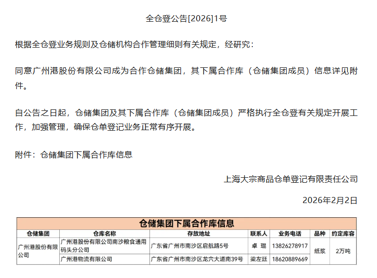 近日,广州港(601228)股份有限公司成功获批成为上海大宗商品仓单登记有限责任公司合作仓储集团,合作品种为纸浆、约定库容2万吨,是全仓登首个股东方以外的仓储集团。通过电子仓单载体,利用全仓登平台,将广州港现货静态库存转化为动态、可信、可融资的资产,大大提升了港存货物交易、交付与融资便利性。