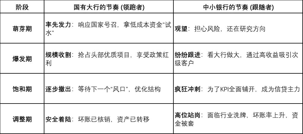 当一个领域蓬勃发展到中后期,竞争加剧,利率被压得很低,且风险开始聚集时,大行因为已经完成了政策使命且获得了早期利润,会提前退出,去等待下一个政策红利。