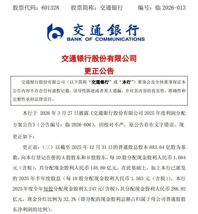 公告称,该行于3月27日披露《交通银行股份有限公司2025年度利润分配方案公告》(公告编号:临2026-006),因校对不严,原公告存在文字错误。