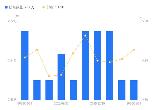 1月14日消息,数据显示,截至2026年1月9日,绿城水务A股股东总户数为2.6万户,较上期(2025年12月31日)不变。公司最新A股总股本为8.83亿股,其中流通A股8.83亿股,户均持有流通A股数量为3.4万股,较上期不变;户均持流通A股市值17.05万元,较上期增加2037.63元,增幅1.21%。