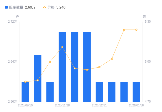 近一年(2025年1月20日至2026年1月20日),绿城水务A股股东户数从2.9万户,减低至2.6万户,降幅10.34%,区间股价上涨14.16%。
