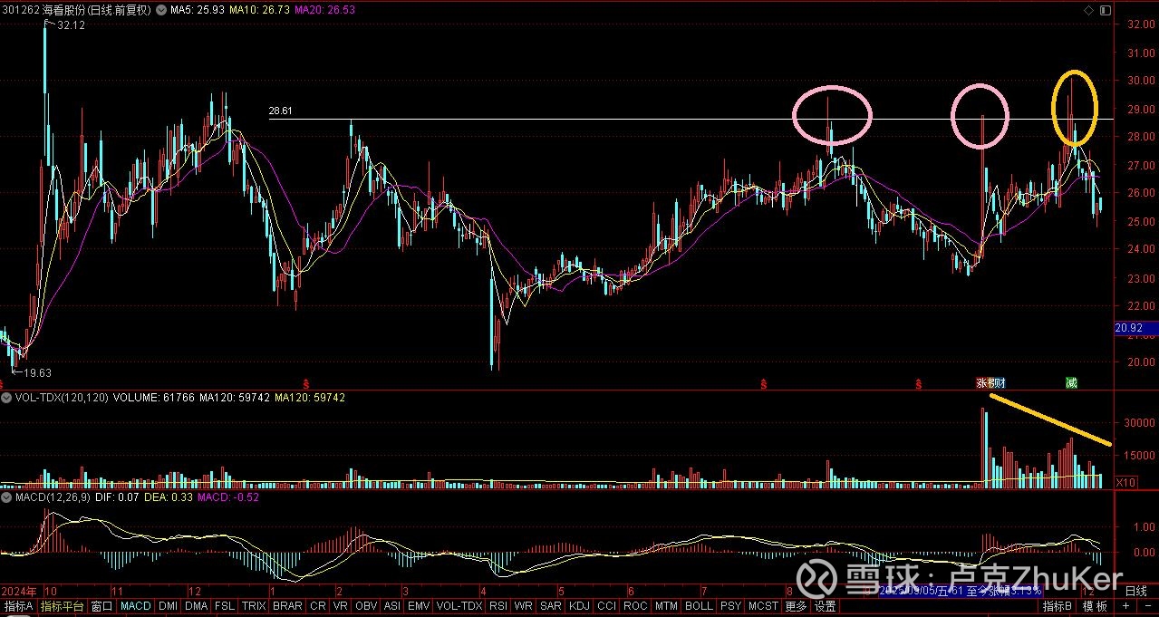 大概率就是机构以抢筹的方式快速建仓行为,随后连续6周的缩量洗盘,遇前期放量影线高点...