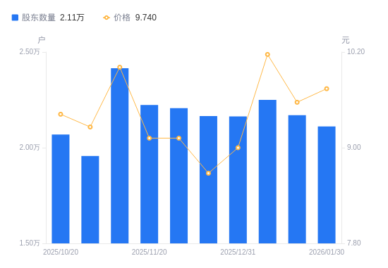 近一年(2025年2月10日至2026年1月30日),中新集团A股股东户数从2.08万户,增加至2.11万户,增幅1.60%,区间股价上涨32.30%。