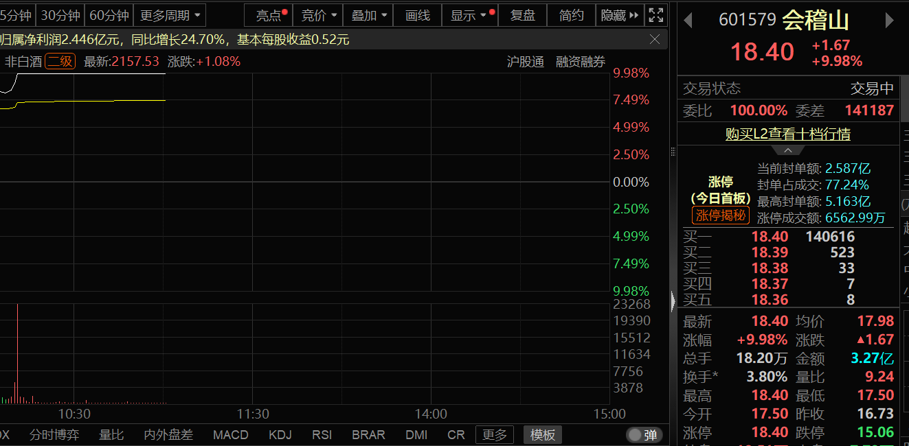 4月1日,会稽山(601579)股价实现涨停。截至发稿,封单金额超2.5亿元。