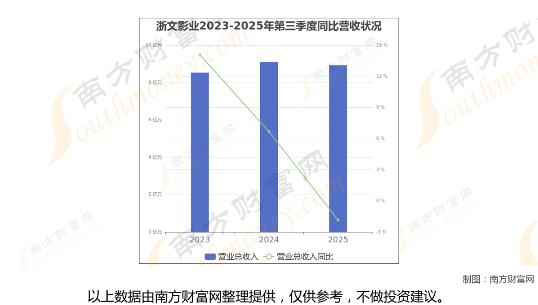 于2025年第三季度,浙文影业披露了其业绩表现(如上图),其中主营业务收入8.93亿元,相较于去年同期-1.84%。