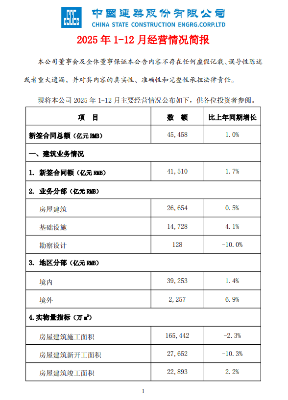 1月15日,中国建筑(601668.SH)发布了2025年1—12月经营情况简报。