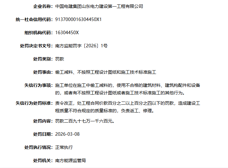 近日,国家能源局资质和信用信息系统处罚信息显示,中国电建(601669)集团山东电力建设第一工程有限公司因偷工减料、不按照工程设计图纸和施工技术标准施工,被南方能源监管局罚款2971600元。