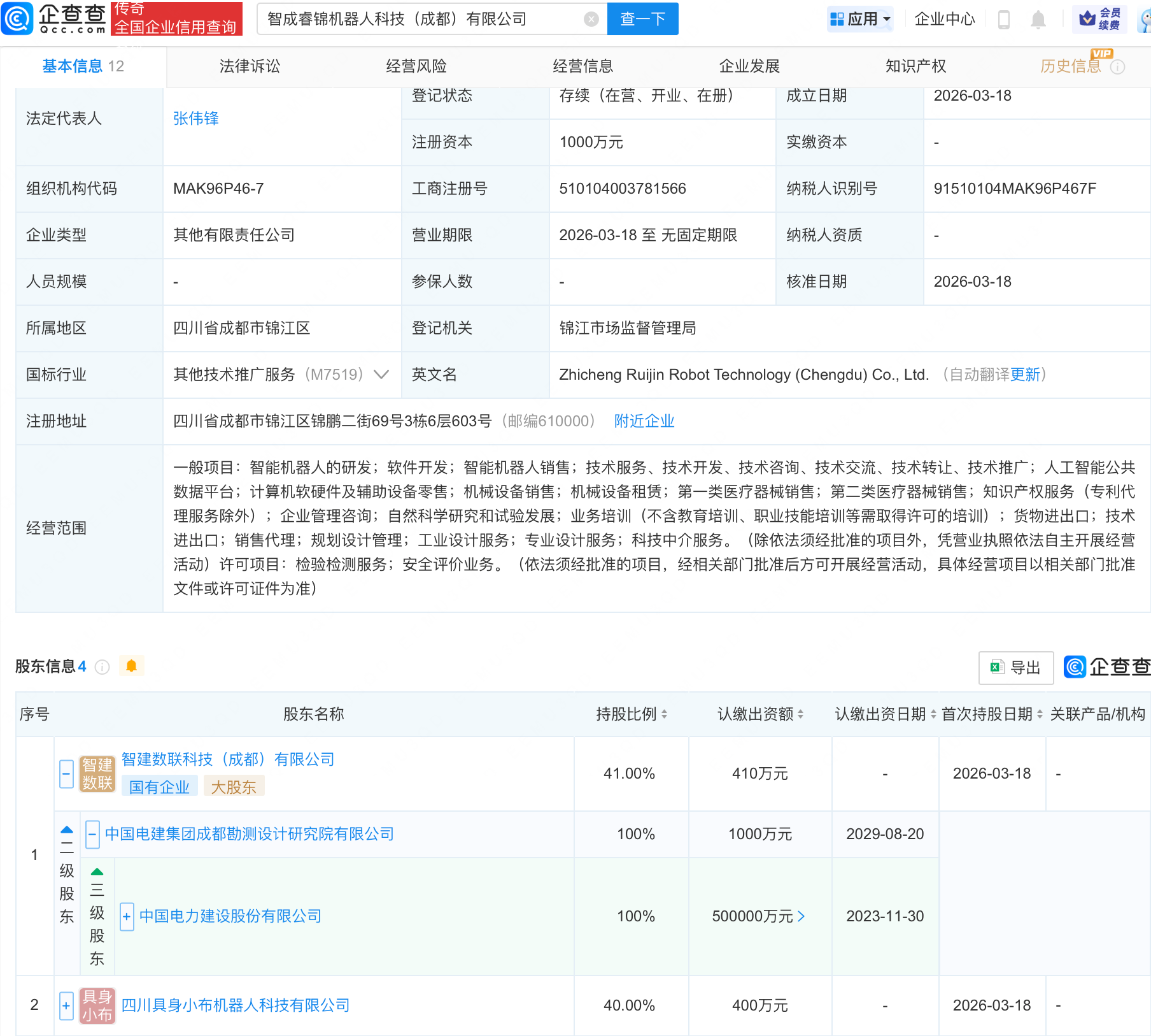 企查查APP显示,近日,智成睿锦机器人科技(成都)有限公司成立,注册资本1000万元,经营范围包含:智能机器人的研发;软件开发;智能机器人销售;人工智能公共数据平台等。企查查股权穿透显示,该公司由中国电建(601669)(601669.SH)旗下智建数联科技(成都)有限公司、四川具身小布机器人科技有限公司等共同持股。