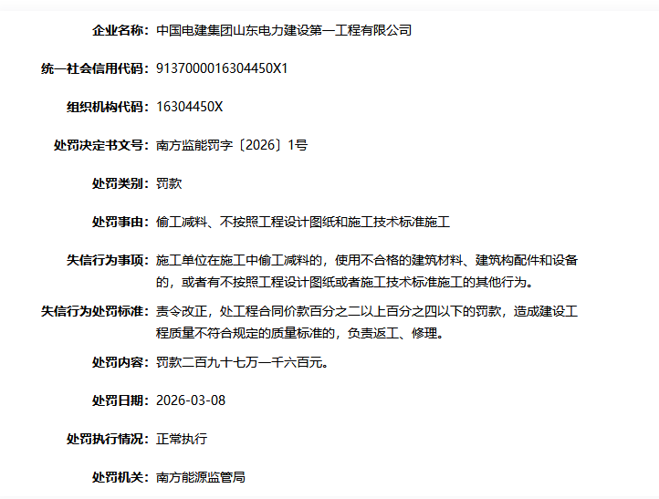 近日,国家能源局南方监管局出具行政处罚决定书(文号:南方监能罚字〔2026〕1号),对中国电建(601669)集团山东电力建设第一工程有限公司(以下简称“山东电建一公司”)依法作出行政处罚,罚款金额达297.16万元,目前该处罚情况为正常执行。