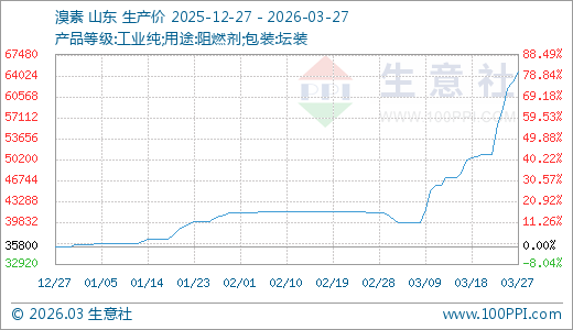 据生意社监测,溴素03月27日最新价格64600.00元/吨,最近5天上涨26.67%,10天上涨28.94%,20天上涨62.72%,90天上涨80.45%。