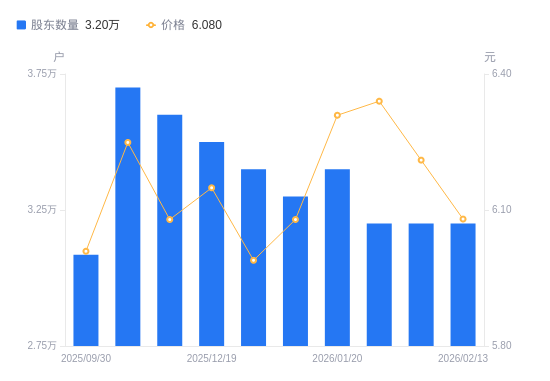 近一年(2025年2月20日至2026年2月13日),友发集团A股股东户数从2.6万户,增加至3.2万户,增幅23.08%,区间股价上涨23.00%。