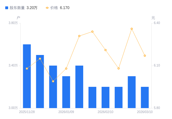 近一年(2025年3月10日至2026年3月10日),友发集团A股股东户数从2.6万户,增加至3.2万户,增幅23.08%,区间股价上涨18.13%。