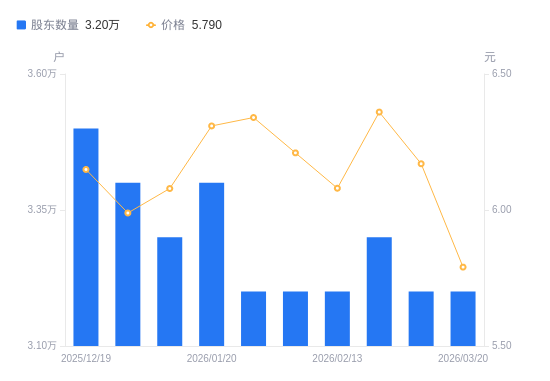 3月23日消息,数据显示,截至2026年3月20日,友发集团A股股东总户数为3.2万户,较上期(2026年3月10日)不变。公司最新A股总股本为14.71亿股,其中流通A股14.71亿股,户均持有流通A股数量为4.6万股,较上期不变;户均持流通A股市值26.62万元,较上期减少1.75万元,降幅6.16%。